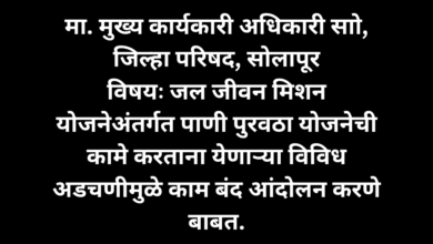मा. मुख्य कार्यकारी अधिकारी साो, जिल्हा परिषद, सोलापूर विषयः जल जीवन मिशन योजनेअंतर्गत पाणी पुरवठा योजनेची कामे करताना येणाऱ्या विविध अडचणीमुळे काम बंद आंदोलन करणे बाबत.
