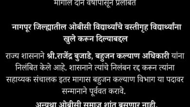 2)”जाहीर निषेध” मागील दोन वर्षापासून प्रलंबित नागपूर जिल्ह्यातील ओबीसी विद्यार्थ्यांचे वस्तीगृह विद्यार्थ्यांना खुले करून दिल्याबद्दल राज्य शासनाने श्री. राजेंद्र बुजाडे,…