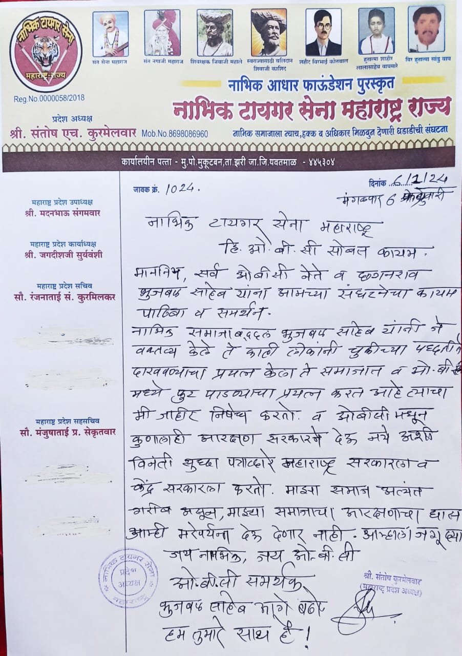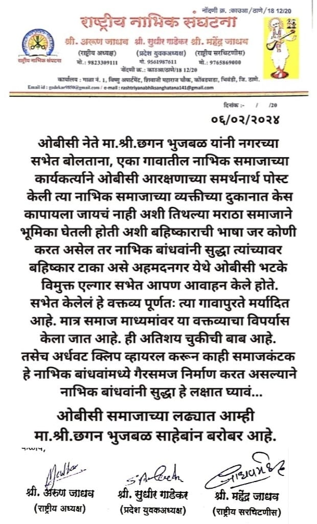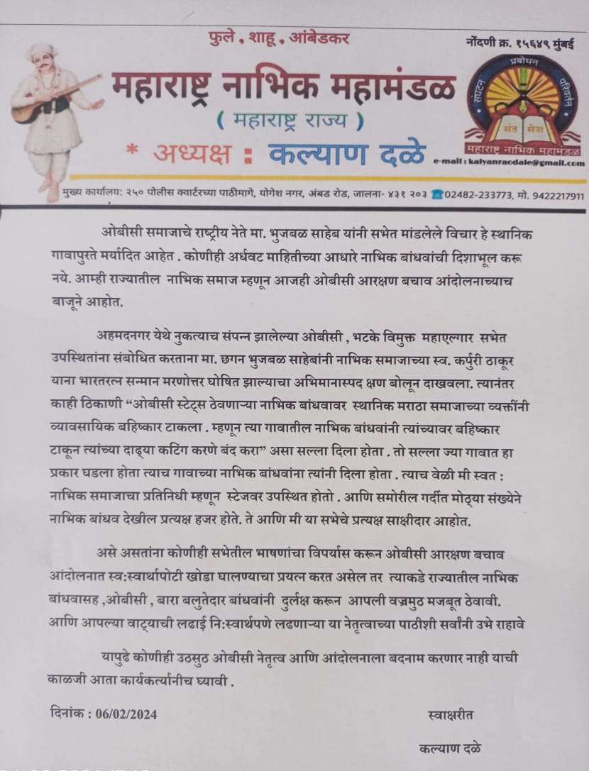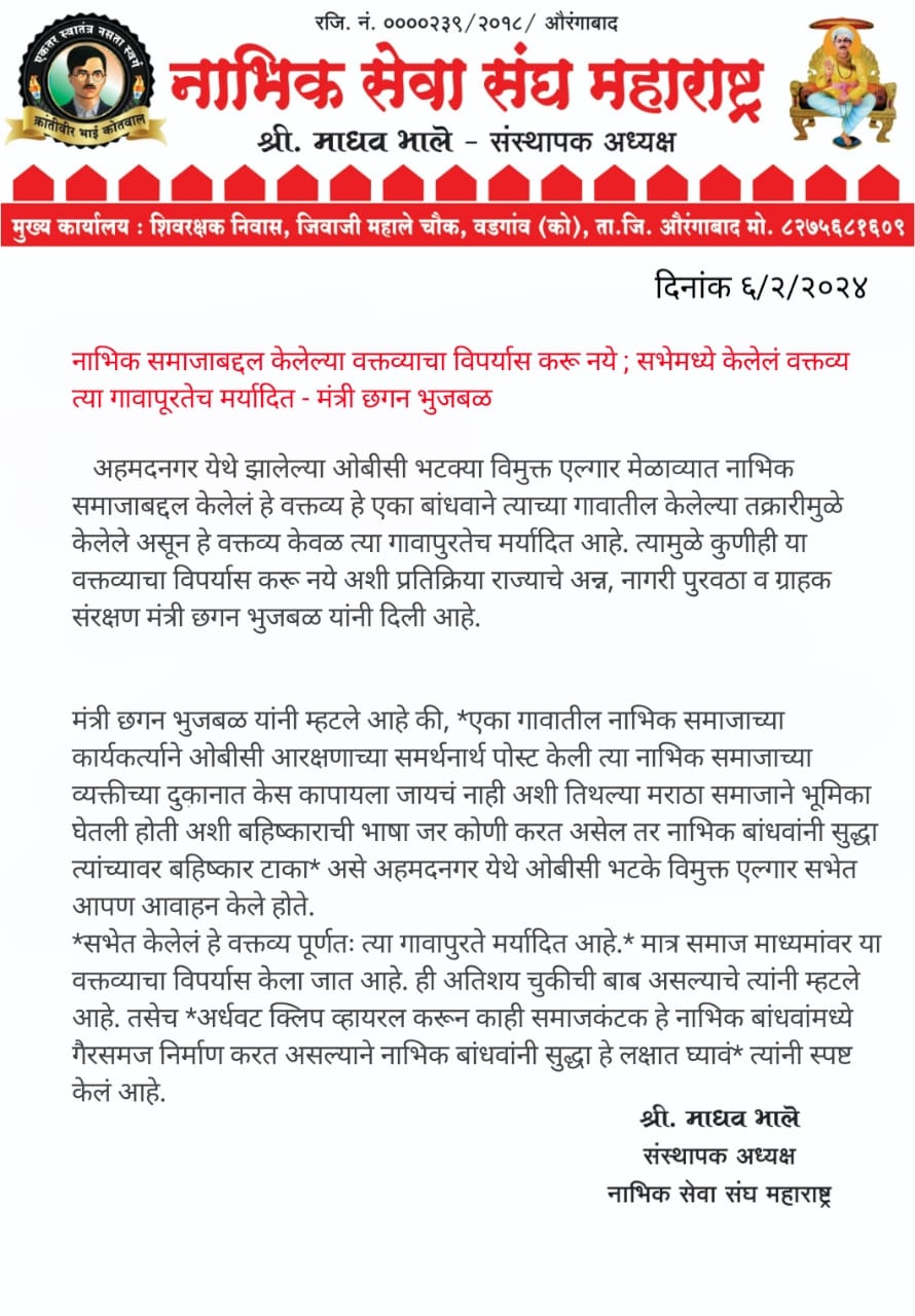 ओबीसी समाजाचे राष्ट्रीय नेते मा. भुजबळ साहेब यांनी सभेत मांडलेले विचार हे स्थानिक गावापुरते मर्यादित आहेत. कोणीही अर्धवट माहितीच्या आधारे नाभिक बांधवांची दिशाभूल करू नये. आम्ही राज्यातील नाभिक समाज म्हणून आजही ओबीसी आरक्षण बचाव आंदोलनाच्याच बाजूने आहोत.