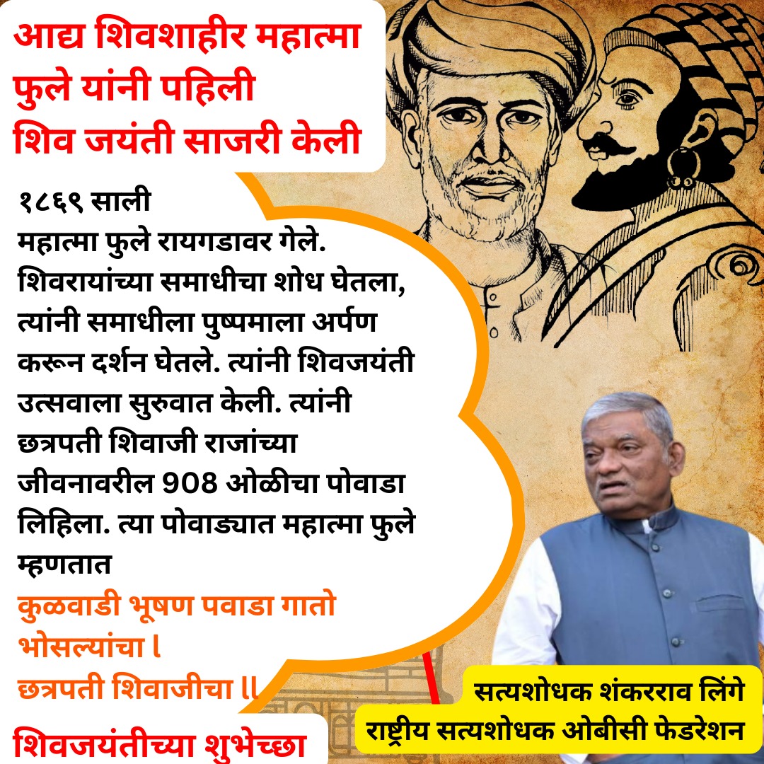 महात्मा ज्योतिराव फुले यांनी 1869 ला रायगडावर जाऊन शिवाजी महाराजांची समाधी पहिल्यांदा शोधून काढली आणि 19 फेब्रुवारी 1869 ला पहिली शिवजयंती साजरी केली’शिवजयंतीचे जनक महात्मा ज्योतिराव फुले* 1869 ला आज महात्मा ज्योतिराव फुले यांनी शिवाजी महाराज यांच्यावर पहिला 908 ओळीचा पोवाडा लिहिला *पहिले शिवशाहीर महात्मा ज्योतिराव फुले*