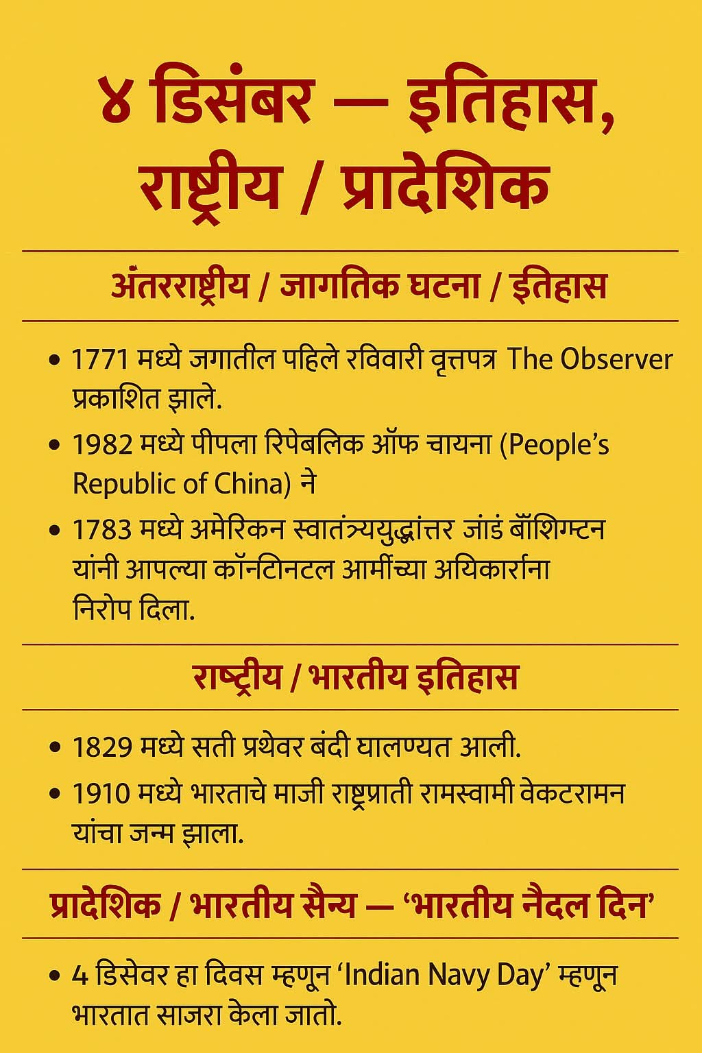 आजच्या दिवशी — १७७१ मध्ये “The Observer” हे जगातील पहिले रविवार वृत्तपत्र प्रकाशित; १८२९ मध्ये सती प्रथेवर बंदी; १९८२ मध्ये चीनने स्वातंत्र्यपूर्वक आपले संविधान स्वीकारले; आणि भारतात हा दिवस “Indian Navy Day” म्हणून साजरा.