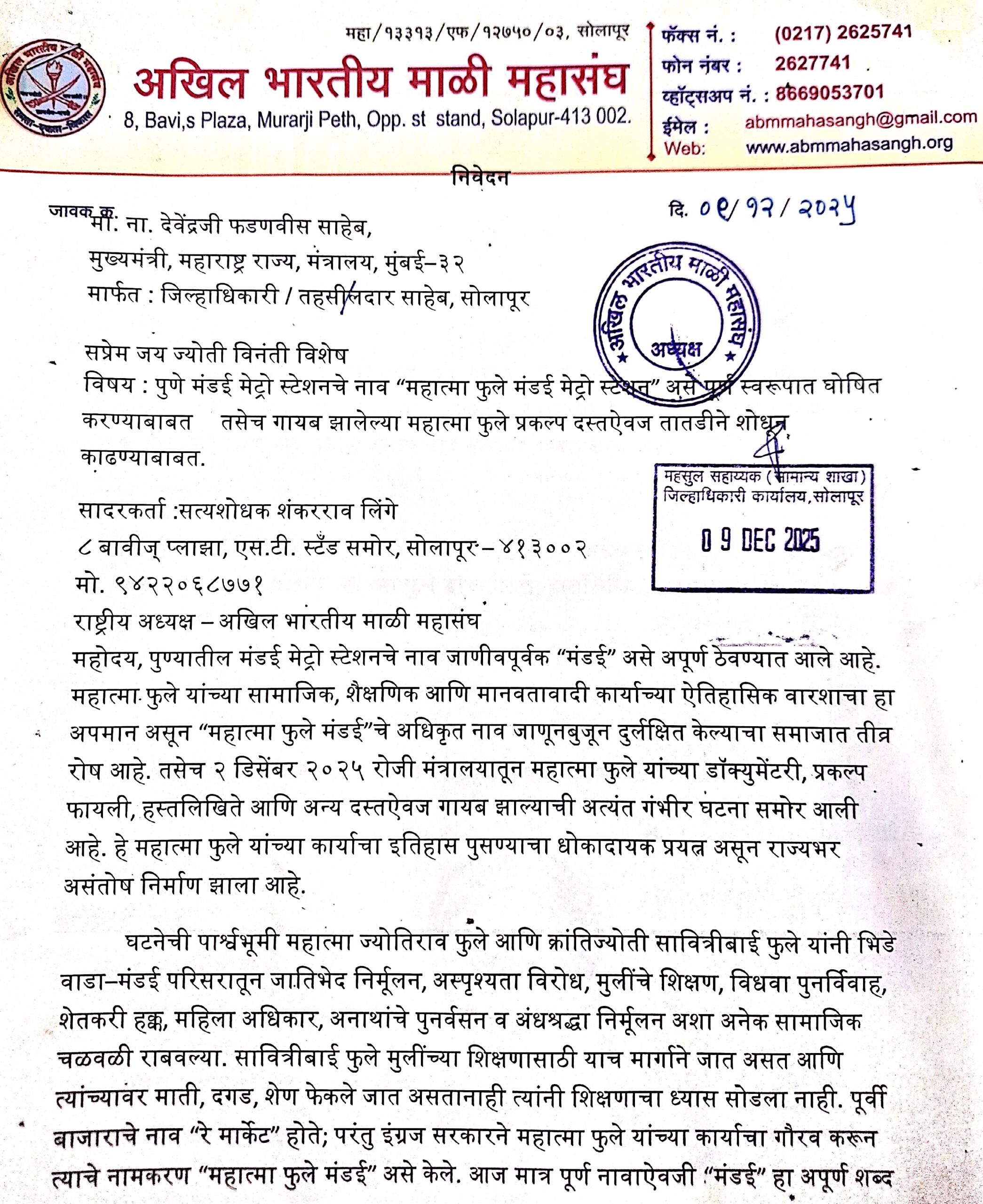 पुण्यातील “मंडई मेट्रो स्टेशन”चे अपूर्ण नाव बदलून “महात्मा फुले मंडई मेट्रो स्टेशन” असे पूर्ण स्वरूपात तात्काळ घोषित करावे, तसेच २ डिसेंबर रोजी मंत्रालयातून गायब झालेली महात्मा फुले डॉक्युमेंटरी, हस्तलिखिते व प्रकल्प फायली त्वरित शोधून काढाव्यात, या मुख्य मागण्यांसह फुले प्रेमी अखिल भारतीय माळी महासंघाने आज सोलापूर जिल्हाधिकारी कार्यालयात जोरदार निवेदन सादर केले. “मंडई” हे अपूर्ण नाव ठेवून महात्मा फुले यांच्या ऐतिहासिक वारशाचा अपमान होत असून यामागे इतिहास पुसण्याचा गंभीर प्रयत्न असल्याचा आरोप निवेदनात करण्यात आला. जिल्हाधिकारी मार्फत माननीय मुख्यमंत्री देवेंद्र फडणवीस साहेबांना हे निवेदन पाठवण्यात आले. निवेदन सादर करताना राष्ट्रीय अध्यक्ष सत्यशोधक शंकरराव लिंगे यांच्या सोबत बापूसाहेब भंडारे, कमलताई गायकवाड, मारुती ढगे, प्रियंका विठ्ठल रेड्डी, डॉ. माधुरी पारपल्लीवार, राजू भंडारे, बजरंग शेंडेकर, किशोर रणदिवे, दीपक गायकवाड, माधवी पोतदार, काशिनाथ पोद्दार आदी मान्यवर उपस्थित होते.