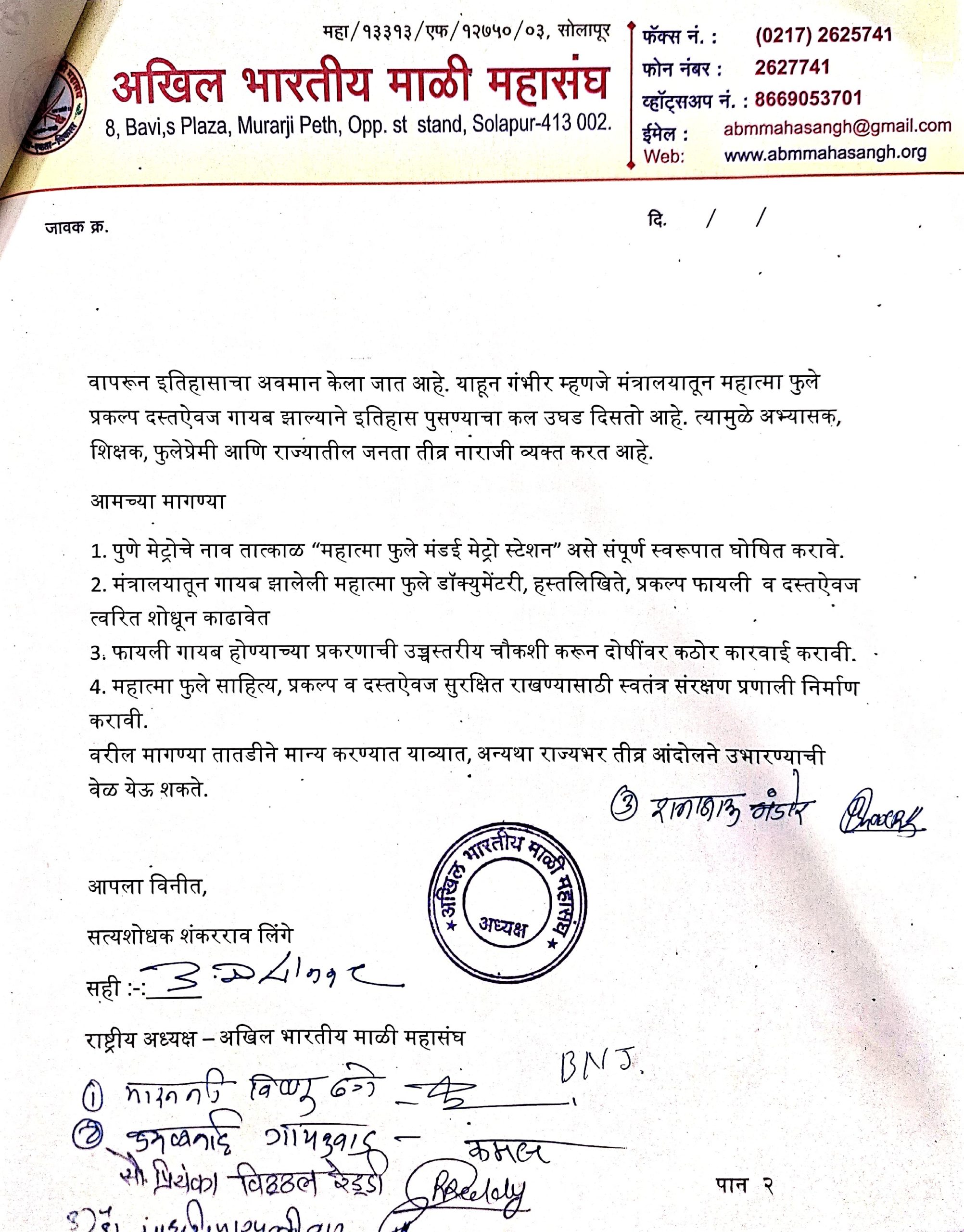 पुणे “महात्मा फुले मंडई मेट्रो स्टेशन”चे पूर्ण नाव जाहीर करा व मंत्रालयातून गायब झालेली महात्मा फु rले प्रकल्प दस्तऐवज तात्काळ शोधा — फुले प्रेमी अखिल भारतीय माळी महासंघाचे जिल्हाधिकारी कार्यालयात निवेदन