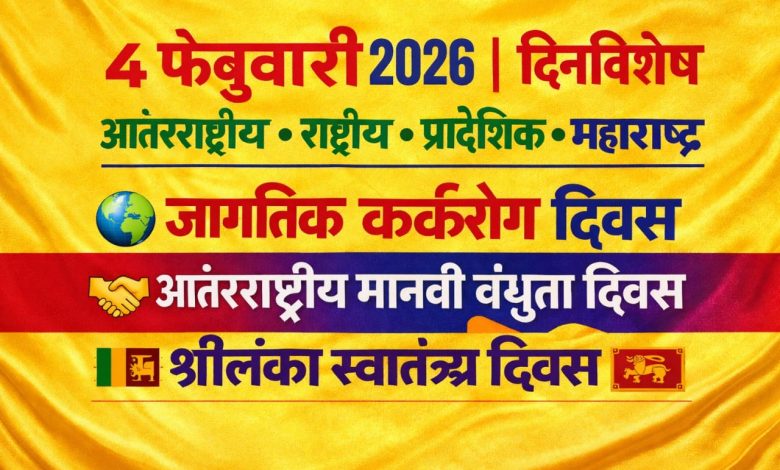 ४ फेब्रुवारी २०२६ | दिनविशेष – आंतरराष्ट्रीय • राष्ट्रीय • प्रादेशिक • महाराष्ट्र