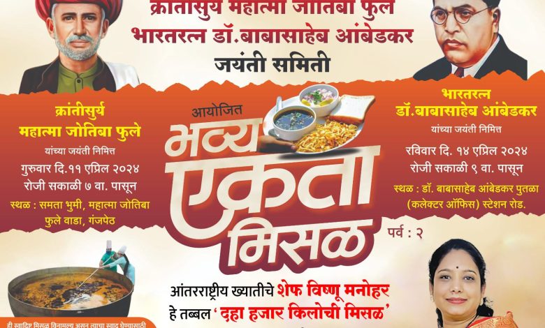 11 एप्रिल क्रांतीसुर्य महात्मा ज्योतिराव फुले यांच्या जयंतीनिमित्त महात्मा फुले वाडा गंजपेठ पुणे येथे एकता फाउंडेशन विष्णूजींनी बनवलेली मिसळ ठेवलेली आहे 5000 किलो मिसळ 11 एप्रिल ला ठेवलेली आहे तरी सर्वांनी महात्मा ज्योतिराव फुले यांना अभिवादन करायला तसेच विष्णूजींनी बनवलेल्या मिसळचा आस्वाद घ्यायला फुले वाडा येथे यावे असे मी सर्वांना आवाहन करते
