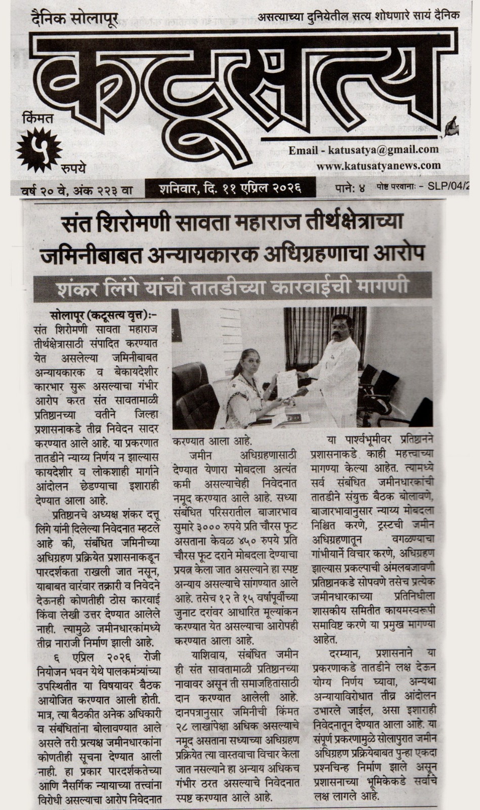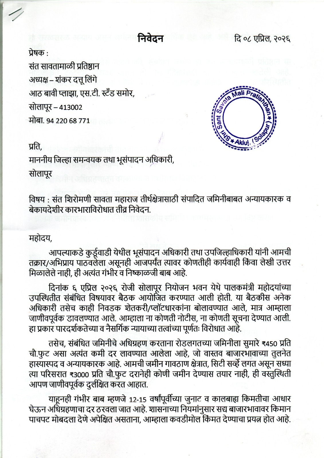 सोलापूर : संत शिरोमणी सावता महाराज तीर्थक्षेत्रासाठी सुरू असलेल्या भूसंपादन प्रक्रियेत प्रशासनाचा मनमानी, अन्यायकारक व संशयास्पद कारभार उघड झाल्याचा गंभीर आरोप संत सावतामाळी प्रतिष्ठानचे अध्यक्ष शंकर दत्तू लिंगे यांनी केला आहे.