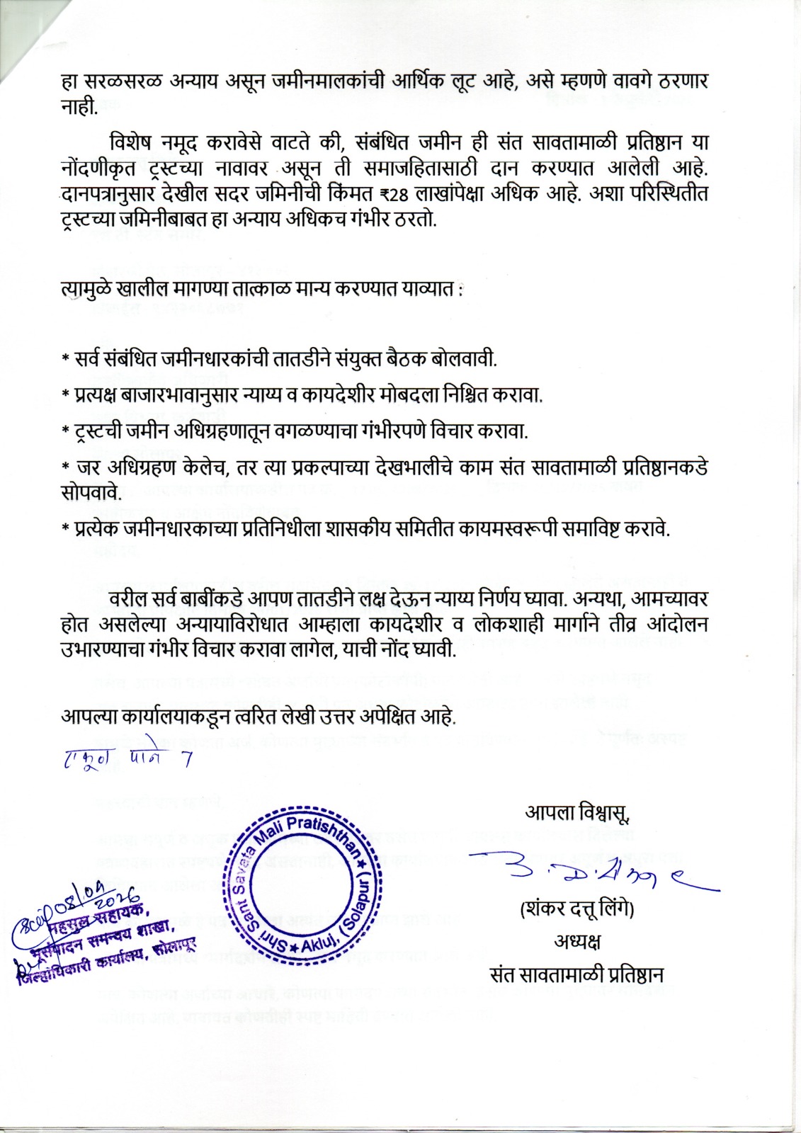 याशिवाय, प्रशासनाने जमीन अधिग्रहणाचा उद्देश स्पष्ट केलेला नाही. जर अधिग्रहण करणार असतील, तर त्या प्रकल्पाची देखभाल संत सावतामाळी प्रतिष्ठानकडे सोपवावी, अशी स्पष्ट मागणी करण्यात आली आहे.