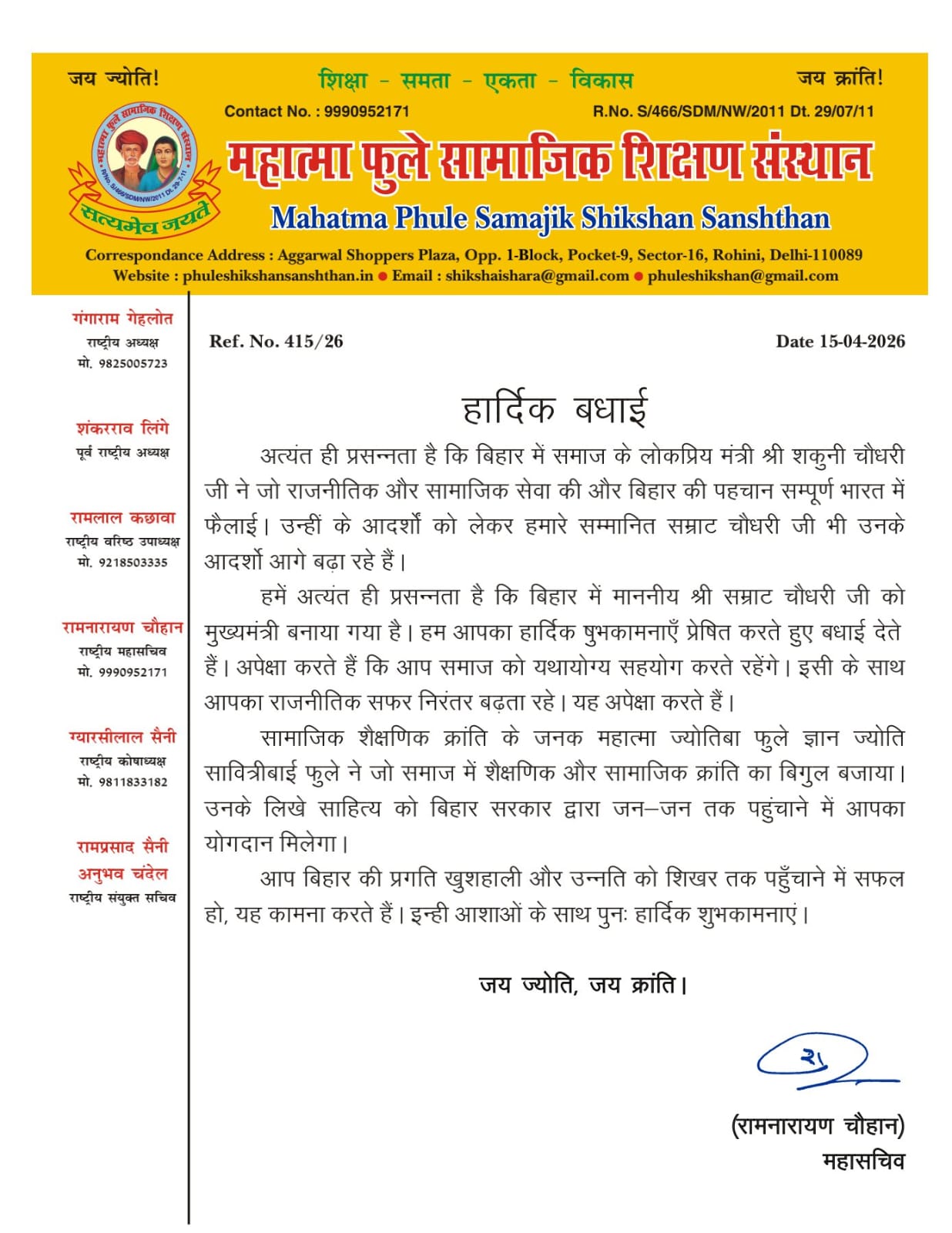 सामाजिक व शैक्षणिक क्रांतीचे जनक महात्मा ज्योतिबा फुले व ज्ञानज्योती सावित्रीबाई फुले यांनी समाजात परिवर्तनाची ज्योत पेटवली. त्यांच्या विचारांचा प्रसार बिहारमध्ये जन-जनांपर्यंत पोहोचवण्यात आपले योगदान महत्त्वपूर्ण ठरेल, असा विश्वास आहे.