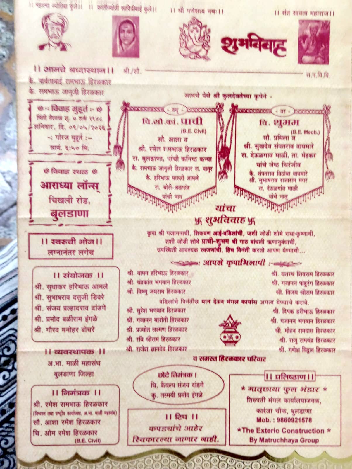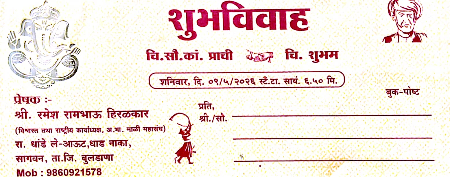 बुलढाणा जिल्ह्यातील सांगरवन परिसरातील प्रतिष्ठित हिरेळकर कुटुंबात आनंदाचे वातावरण असून चि. सौ. का. प्राची व चि. शुभम यांचा शुभविवाह सोहळा मोठ्या उत्साहात संपन्न होत आहे.