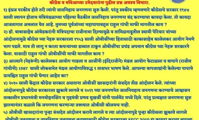 १) इंग्रज परकीय होते तरी त्यांनी जातनिहाय जनगणना सुरु केली. परंतु स्वकीय म्हणवणारे काँग्रेसचे सरकार १९४७ साली स्थापन होताच मंत्रिमंडळाच्या पहिल्या बैठकीत जातनिहाय जनगणना बंद करण्याचा कायदा केला. तो कायदा आजतागात अमलात येत आहे. तुमच्या पूर्वजांच्या महापापाबद्दल राहुल गांधी माफी मागतील काय ?