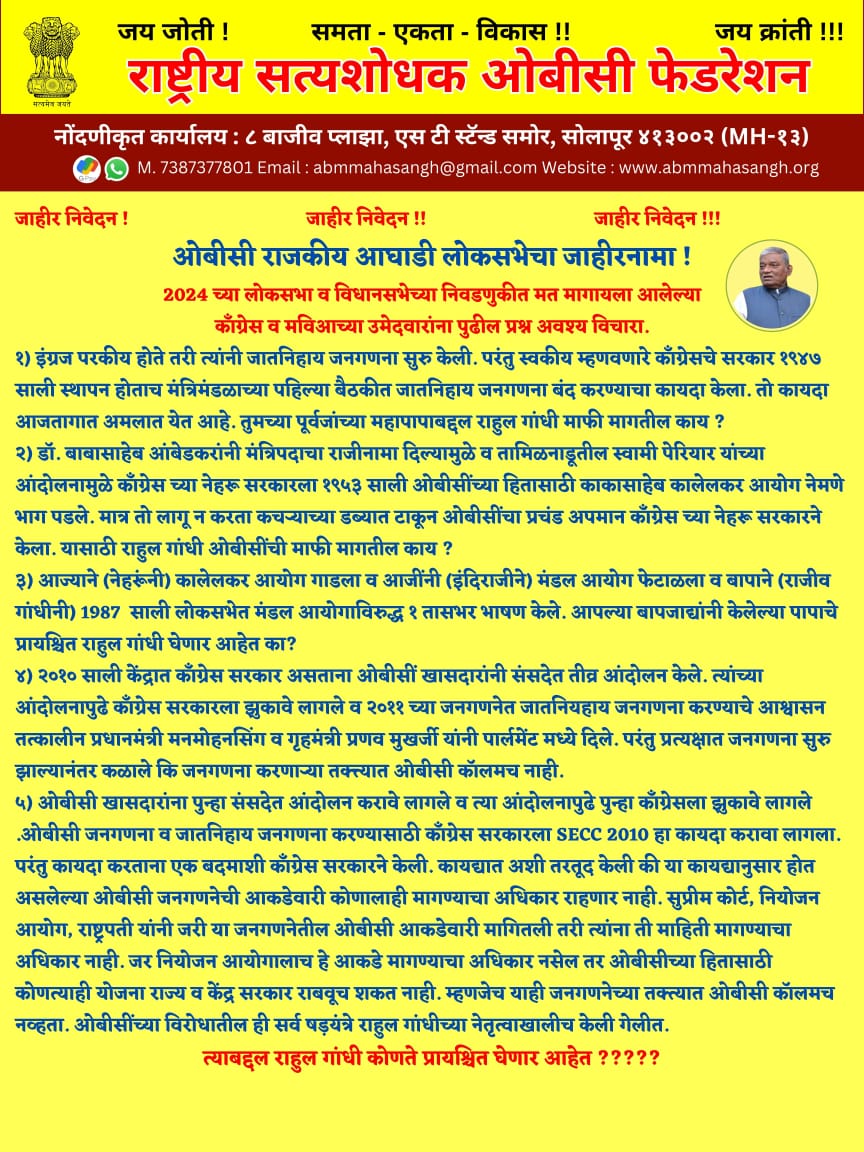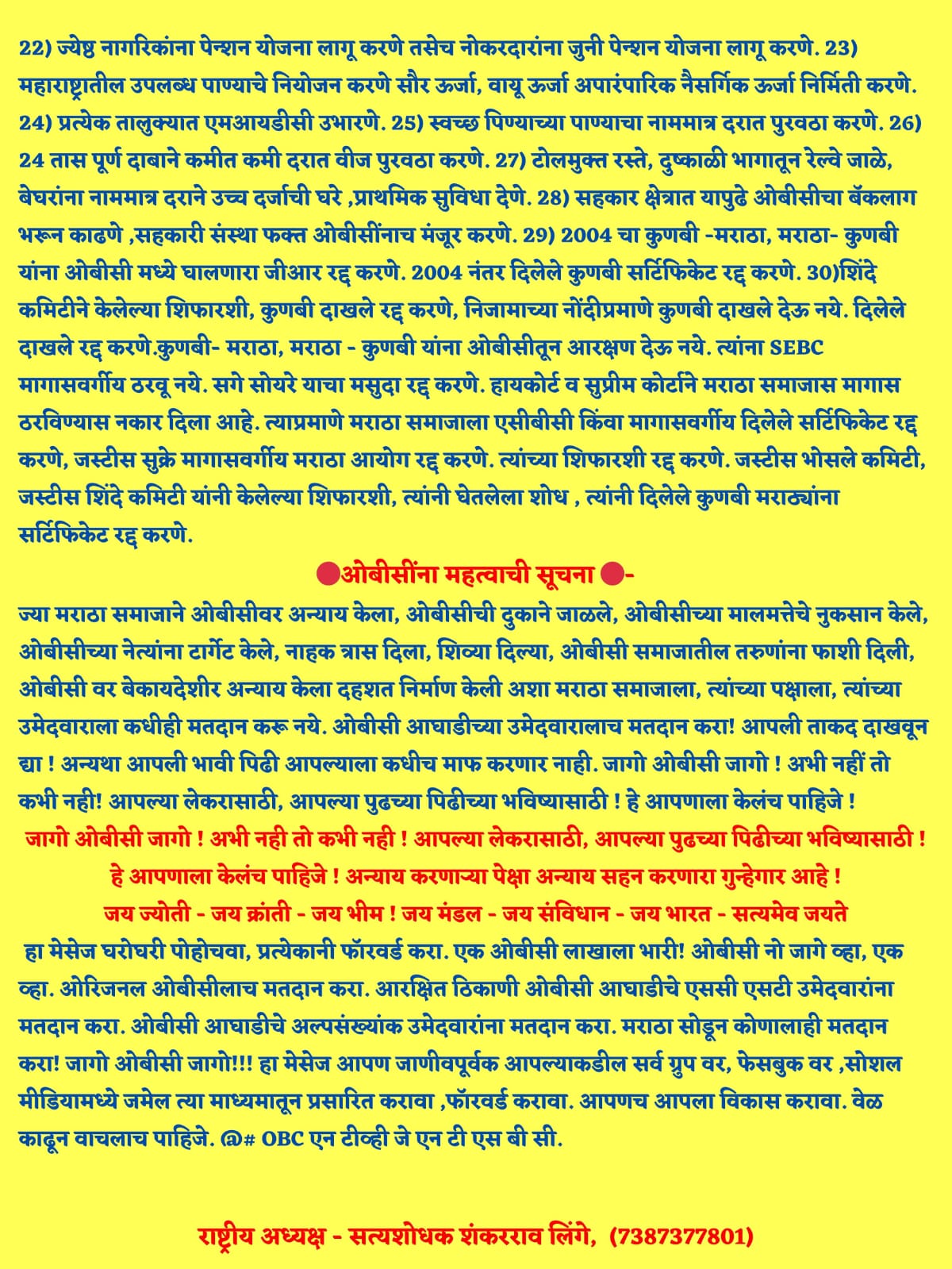 ज्या मराठा समाजाने ओबीसीवर अन्याय केला, ओबीसीची दुकाने जाळले, ओबीसीच्या मालमत्तेचे नुकसान केले, ओबीसीच्या नेत्यांना टार्गेट केले, नाहक त्रास दिला, शिव्या दिल्या, ओबीसी समाजातील तरुणांना फाशी दिली, ओबीसी वर बेकायदेशीर अन्याय केला दहशत निर्माण केली अशा मराठा समाजाला, त्यांच्या पक्षाला, त्यांच्या उमेदवाराला कधीही मतदान करू नये. ओबीसी आघाडीच्या उमेदवारालाच मतदान करा! आपली ताकद दाखवून द्या ! अन्यथा आपली भावी पिढी आपल्याला कधीच माफ करणार नाही. जागो ओबीसी जागो ! अभी नहीं तो कभी नही! आपल्या लेकरासाठी, आपल्या पुढच्या पिढीच्या भविष्यासाठी ! हे आपणाला केलंच पाहिजे !