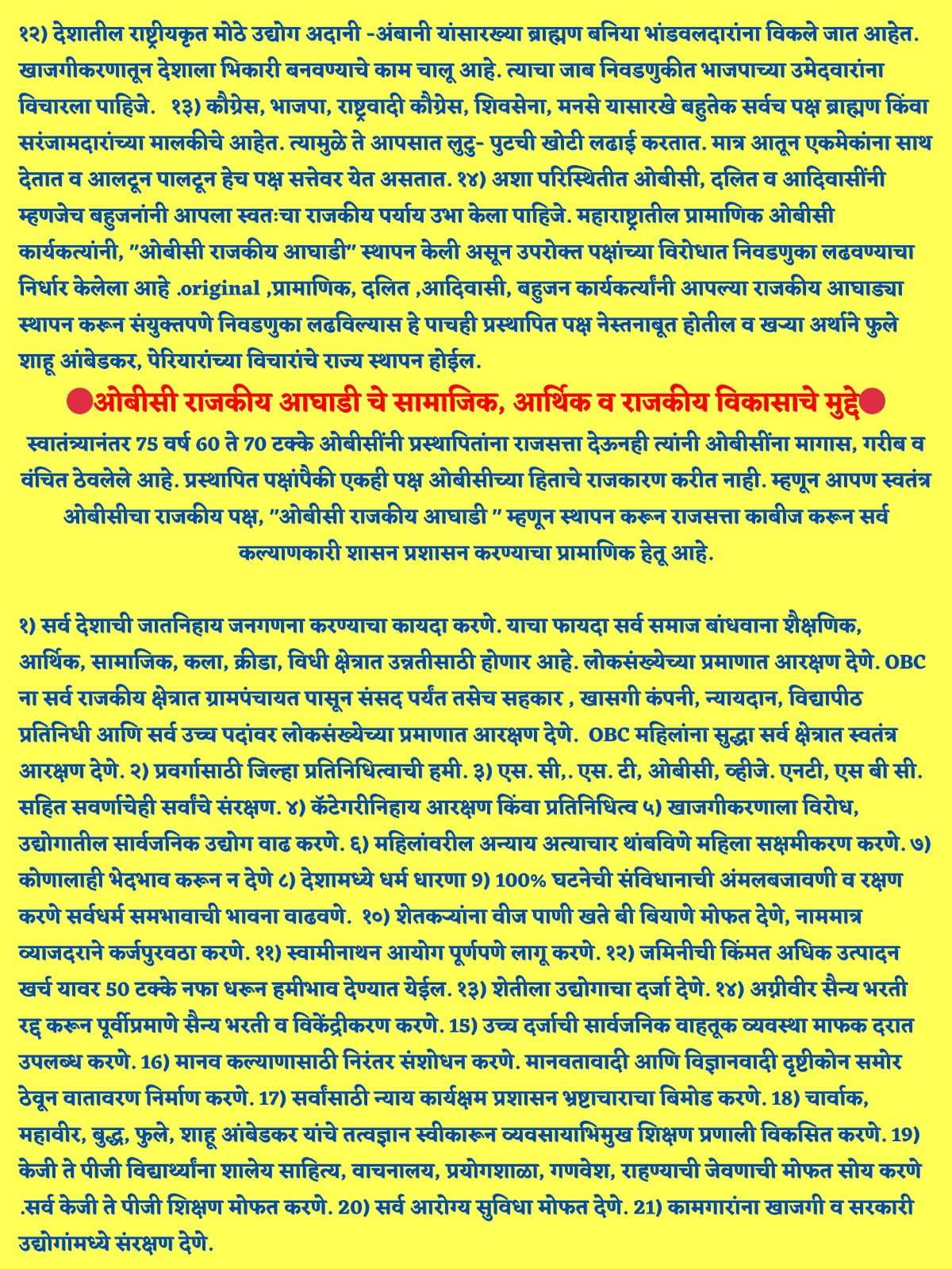 १) सर्व देशाची जातनिहाय जनगणना करण्याचा कायदा करणे. याचा फायदा सर्व समाज बांधवाना शैक्षणिक, आर्थिक, सामाजिक, कला, क्रीडा, विधी क्षेत्रात उन्नतीसाठी होणार आहे. लोकसंख्येच्या प्रमाणात आरक्षण देणे. Oвс ना सर्व राजकीय क्षेत्रात ग्रामपंचायत पासून संसद पर्यंत तसेच सहकार, खासगी कंपनी, न्यायदान, विद्यापीठ प्रतिनिधी आणि सर्व उच्च पदांवर लोकसंख्येच्या प्रमाणात आरक्षण देणे. OBC महिलांना सुद्धा सर्व क्षेत्रात स्वतंत्र आरक्षण देणे. २) प्रवर्गासाठी जिल्हा प्रतिनिधित्वाची हमी. ३) एस. सी. एस. टी, ओबीसी, व्हीजे. एनटी, एस बी सी. सहित सवर्णाचेही सर्वांचे संरक्षण. ४) कॅटेगरीनिहाय आरक्षण किंवा प्रतिनिधित्व ५) खाजगीकरणाला विरोध, उद्योगातील सार्वजनिक उद्योग वाढ करणे. ६) महिलांवरील अन्याय अत्याचार थांबविणे महिला सक्षमीकरण करणे. ७) कोणालाही भेदभाव करून न देणे ८) देशामध्ये धर्म धारणा 9) 100% घटनेची संविधानाची अंमलबजावणी व रक्षण करणे सर्वधर्म समभावाची भावना वाढवणे. १०) शेतकऱ्यांना वीज पाणी खते बी बियाणे मोफत देणे, नाममात्र व्याजदराने कर्जपुरवठा करणे. ११) स्वामीनाथन आयोग पूर्णपणे लागू करणे. १२) जमिनीची किंमत अधिक उत्पादन खर्च यावर 50 टक्के नफा धरून हमीभाव देण्यात येईल. १३) शेतीला उद्योगाचा दर्जा देणे. देशामध्ये पावसाचे पाणी सुमारे एक लाख 41 हजार टीएमसी दरवर्षी पडते त्यापैकी आज पर्यंत चाळीस हजार टीएमसी पाणी अडवलेले आहे 75000 टीएमसी पाणी बाष्पीभवन होते हवेत निघून जाते ते थांबवणे बाष्पीभवन कमी करणे उर्वरित 30-40000 टीएमसी पाणी आडवीने नद्या जोड प्रकल्प राबविणे प्रलंबित पाट बंधारे योजना अग्रक्रमाने पूर्ण करणे आधुनिक सिंचन योजना शेतकऱ्यांना मोफत देणे १४) अग्रीवीर सैन्य भरती रद्द करून पूर्वीप्रमाणे सैन्य भरती व विकेंद्रीकरण करणे. 15) उच्च दर्जाची सार्वजनिक वाहतूक व्यवस्था माफक दरात उपलब्ध करणे. 16) मानव कल्याणासाठी निरंतर संशोधन करणे. मानवतावादी आणि विज्ञानवादी दृष्टीकोन समोर ठेवून वातावरण निर्माण करणे. 17) सर्वांसाठी न्याय कार्यक्षम प्रशासन भ्रष्टाचाराचा बिमोड करणे. 18) चार्वाक, महावीर, बुद्ध, फुले, शाहू आंबेडकर यांचे तत्वज्ञान स्वीकारून व्यवसायाभिमुख शिक्षण प्रणाली विकसित करणे. 19)