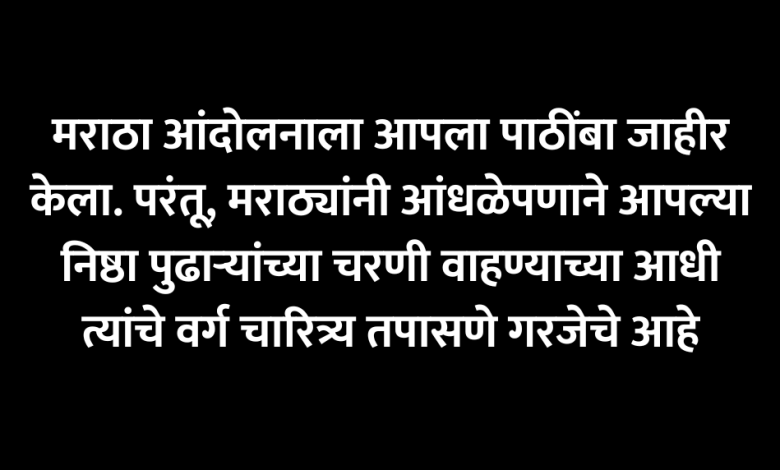 मराठा आंदोलनाला आपला पाठींबा जाहीर केला. परंतू, मराठ्यांनी आंधळेपणाने आपल्या निष्ठा पुढाऱ्यांच्या चरणी वाहण्याच्या आधी त्यांचे वर्ग चारित्र्य तपासणे गरजेचे आहे