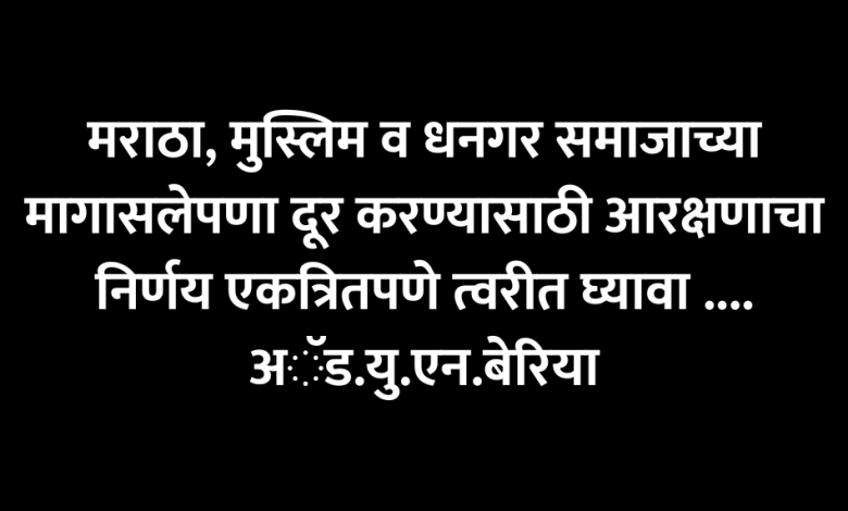मराठा, मुस्लिम व धनगर समाजाच्या मागासलेपणा दूर करण्यासाठी आरक्षणाचा निर्णय एकत्रितपणे त्वरीत घ्यावा …. अॅड.यु.एन.बेरिया