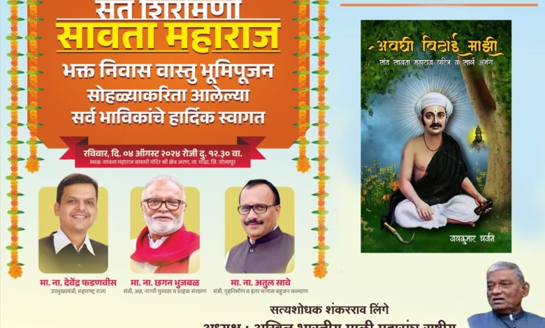 संत शिरोमणी सावता महाराज संजीवन समाधी तीर्थक्षेत्र तालुका माढा जिल्हा सोलापूर येथे चार आगस्ट 2024 ला भक्ती निवासाचे उद्घाटन भव्य सावता भक्त महामेळावा होणार आहे