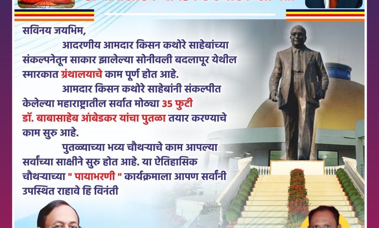 आदरणीय आमदार किसन कथोरे साहेबांच्या संकल्पनेतून साकार झालेल्या सोनीवली बदलापूर येथील स्मारकात ग्रंथालयाचे काम पूर्ण होत आहे. आमदार किसन कथोरे साहेबांनी संकल्पीत केलेल्या महाराष्ट्रातील सर्वात मोठ्या 35 फुटी डॉ. बाबासाहेब आंबेडकर यांचा पुतळा तयार करण्याचे काम सुरु आहे. पुतळ्याच्या भव्य चौथऱ्याचे काम आपल्या सर्वांच्या साक्षीने सुरु होत आहे. या ऐतिहासिक चौथऱ्याच्या ” पायाभरणी ” कार्यक्रमाला आपण सर्वांनी उपस्थित राहावे हि विनंती