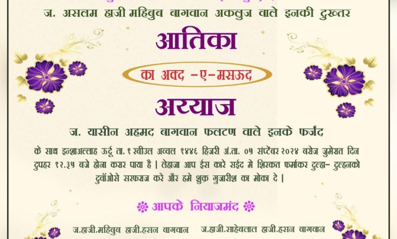 के साथ इन्शाअल्लाह ऊर्दू ता. १ स्वीउल अव्वल १४४६ हिजरी अं.ता. ०५ संप्टेंबर २०२४ बरोज जुमेरात दिन दुपहर १२.३५ बजे होना करार पाया है। लेहाजा आप ईस कारे सईद में शिरकत फर्माकर दुल्हा दुल्हनको दुवोंओसे सरफराज करे और हमे शुक्र गुजारीश का मोका दे।