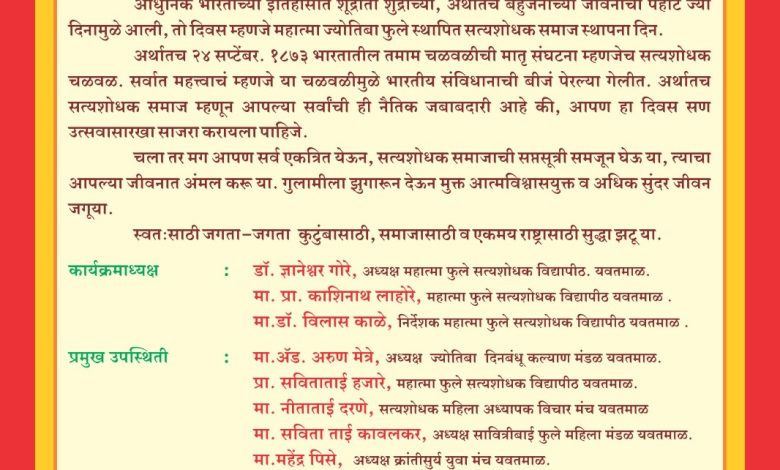 स्थळ :-महात्मा फुले सत्यशोधक विद्यापीठ मोहाफाटा यवतमाळ . सत्यशोधक समाजाच्या तसेच फुले शाहू आंबेडकर विचारधारेला मानणाऱ्या मान्यवरांनी सदर कार्यक्रमात उपस्थित रहावे असे आवाहन आयोजकांनी केलेले आहे