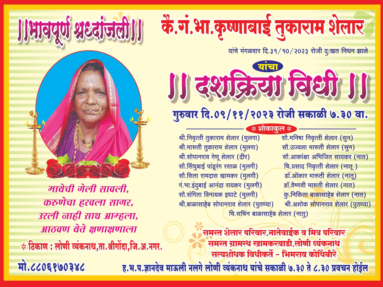 कु ओंकार शेलार नातू असा आणखी मोठा परिवार असून *मातोश्री कृष्णाबाई तुकाराम शेलार यांचा दशक्रिया विधी दिनांक 9/ 11 /20 23 रोजी आठ वाजता मुक्काम लोणी व्यंकनाथ तालुका श्रीगोंदा जिल्हा अहमदनगर येथे दशपिंडी दशक्रिया महात्मा फुले स्थापित सत्यशोधक समाज नुसार होईल* विनित श्री निवृत्ती तुकाराम शेलार श्री मारुती तुकाराम शेलार