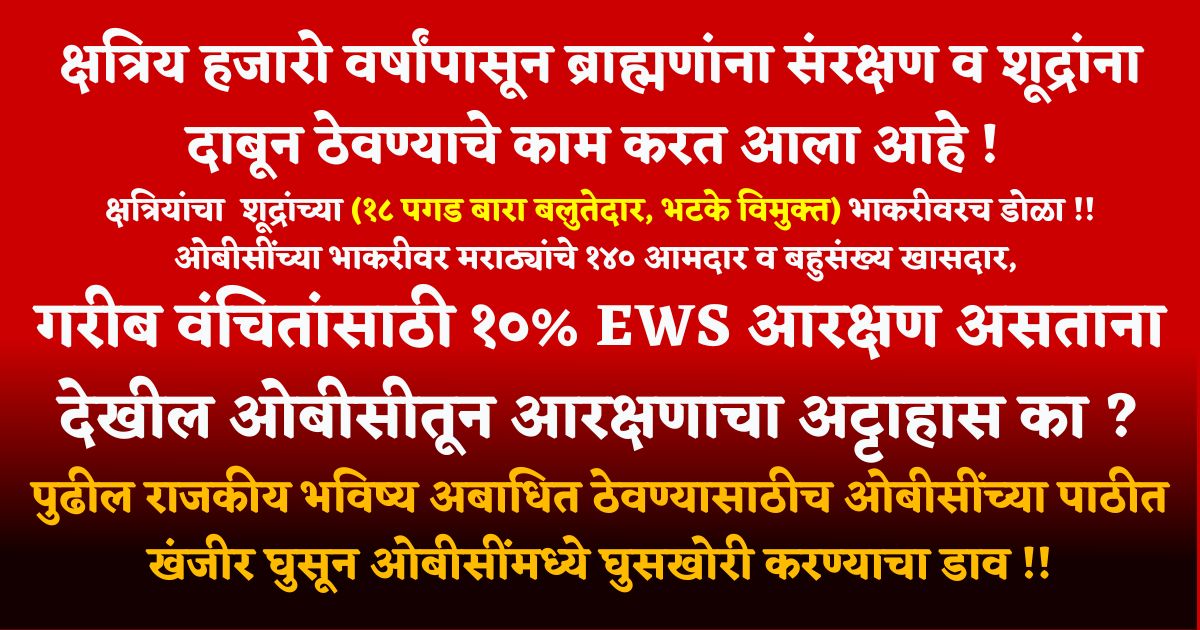 म्हणून पडद्यामागून राज कारण खेळणारा हा जरासंध वेळीच संपवायला हवा किंबहुना सर्वच थरातून त्याच्या या अमानवी कृत्यांचा निषेध होणे गरजेचे आहे.माळी समाज याला विरोध करत आहेच परंतु इतर ओबीसी घटकातून जेव्हढा विरोध व्ह्यायला हवा तेवढा होताना दिसत नाही. तेव्हा सकल मराठा तरुण आणि ओबीसी समाज बांधवांनो त्याच बरोबर शासन कर्त्यानो ह्या जरासंधाची चाल वेळीच ओळखा आणि त्याला आवर घाला. सत्यशोधक दिन बंधू न्यूज संपादक शंकरराव लिंगे 73 87 37 78 01