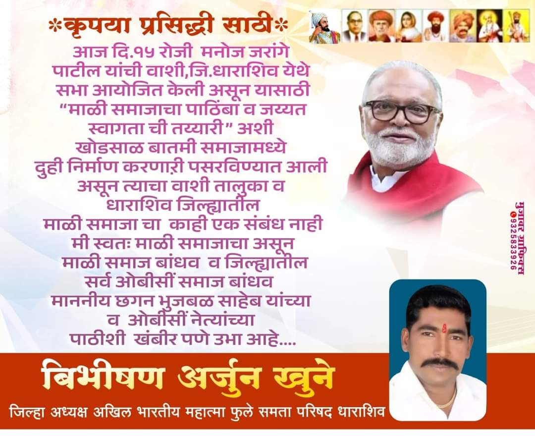 आज दि.१५ रोजी मनोज जरांगे पाटील यांची वाशी, जि. धाराशिव येथे सभा आयोजित केली असून यासाठी ” माळी समाजाचा पाठिंबा व जय्यत स्वागताची तय्यारी” अशी खोडसाळ बातमी समाजामध्ये दुही निर्माण करणारी पसरविण्यात आली असून त्याचा वाशी तालुका व धाराशिव जिल्ह्यातील माळी समाजाचा काही एक संबंध नाही मी स्वतः माळी समाजाचा असून माळी समाज बांधव व जिल्ह्यातील सर्व ओबीसीं समाज बांधव माननीय छगन भुजबळ साहेब यांच्या व ओबीसी नेत्यांच्या पाठीशी खंबीर पणे उभा आहे….