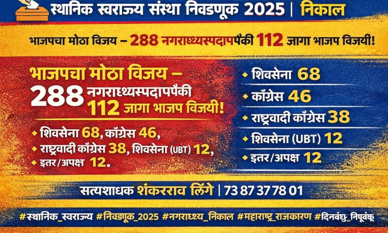 भाजपचा मोठा विजय – 288 नगराध्यक्षपदांपैकी सर्वाधिक 112 जागांवर भाजप विजयी.