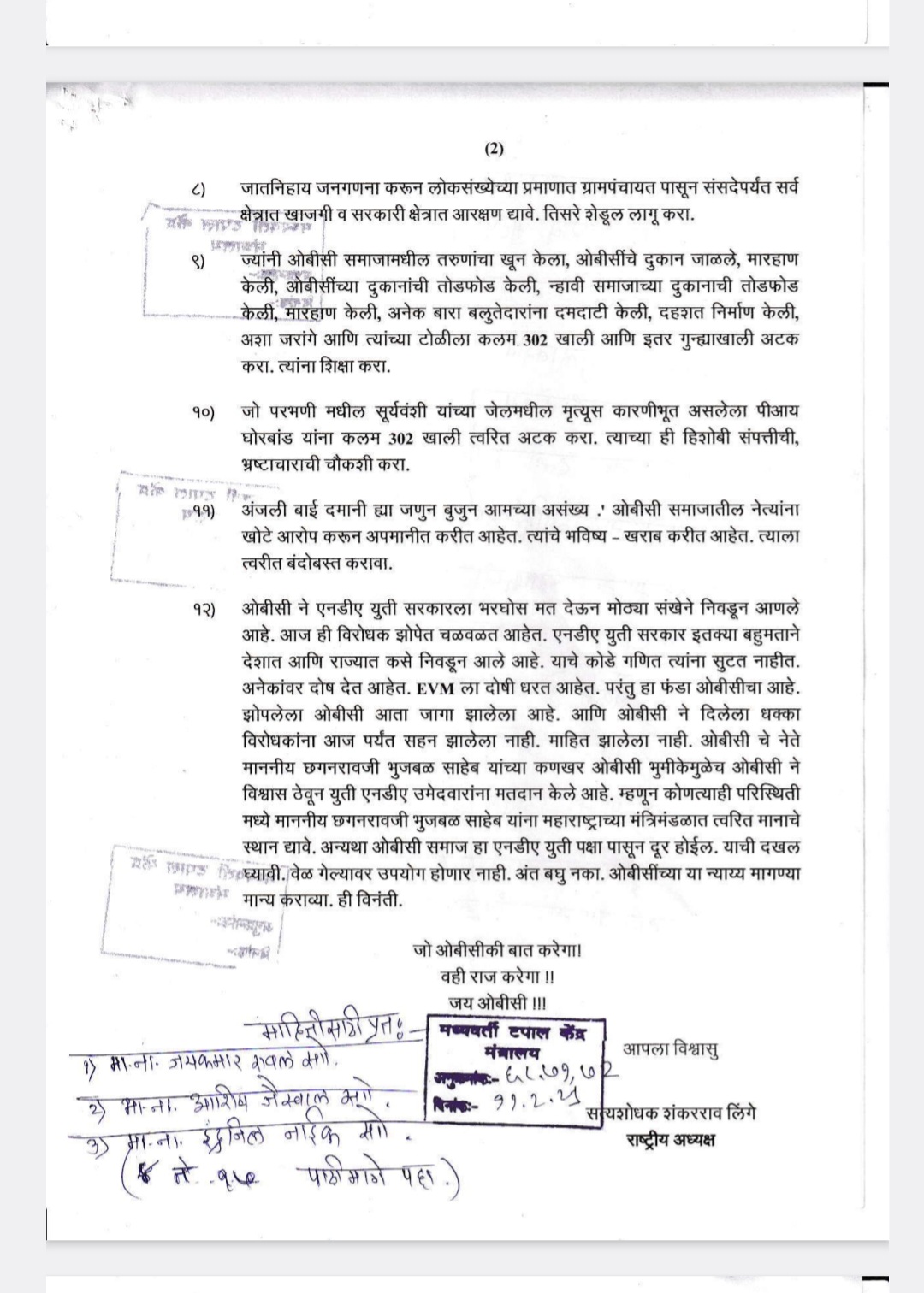१२) ओबीसी ने एनडीए युती सरकारला भरघोस मत देऊन मोठ्या संखेने निवडून आणले आहे. आज ही विरोधक झोपेत चळवळत आहेत. एनडीए युती सरकार इतक्या बहुमताने देशात आणि राज्यात कसे निवडून आले आहे. याचे कोडे गणित त्यांना सुटत नाहीत. अनेकांवर दोष देत आहेत. EVM ला दोषी धरत आहेत. परंतु हा फंडा ओबीसीचा आहे. झोपलेला ओबीसी आता जागा झालेला आहे. आणि ओबीसी ने दिलेला धक्का विरोधकांना आज पर्यंत सहन झालेला नाही. माहित झालेला नाही. ओबीसी चे नेते माननीय छगनरावजी भुजबळ साहेब यांच्या कणखर ओबीसी भुमीकेमुळेच ओबीसी ने विश्वास ठेवून युती एनडीए उमेदवारांना मतदान केले आहे. म्हणून कोणत्याही परिस्थिती मध्ये माननीय छगनरावजी भुजबळ साहेब यांना महाराष्ट्राच्या मंत्रिमंडळात त्वरित मानाचे स्थान द्यावे. अन्यथा ओबीसी समाज हा एनडीए युती पक्षा पासून दूर होईल. याची दखल घ्यिावी. वेळ गेल्यावर उपयोग होणार नाही. अंत बघु नका. ओबीसींच्या या न्याय्य मागण्या मान्य कराव्या. ही विनंती.