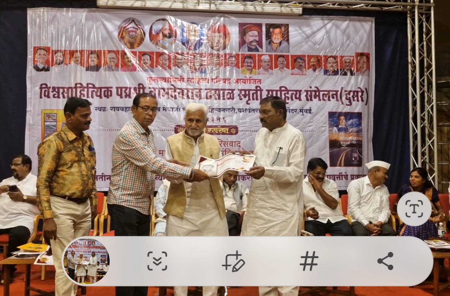 अखिल भारतीय माळी महासंघ राष्ट्रीय अध्यक्ष ओबीसी नेते दीनबंधू न्यूज संपादक सत्यशोधक शंकरराव लिंगे यांचा विश्व साहित्यिक नामदेव ढसाळ साहित्य संमेलनामध्ये प्रशस्तीपत्र ग्रंथ देऊन यशवंतराव चव्हाण प्रतिष्ठान आद्य कामगार नेते सत्यशोधक दिन बंधू संपादक नारायण मेघाजी लोखंडे नगरीत पत्रकारिता समाज जागृती लेखनाबद्दल पुरस्कृत करून संमेलनाचे अध्यक्ष अशोक टाव्हरे याच्या हस्ते करण्यात आला यावेळी दक्षिण सोलापूर अध्यक्ष पंचाप्पा धनशेट्टी सोलापूर अध्यक्ष राजे कोळी नारायण मेघाजी लोखंडे यांचे पण तू गोपीनाथ लोखंडे इत्यादी मान्यवर उपस्थित होते लिंगे यांना दीनबंधू न्यूज पत्रकारितेचा पुरस्कार दिल्याबद्दल देशभरातून शुभेच्छा चा वर्षाव होत आहे