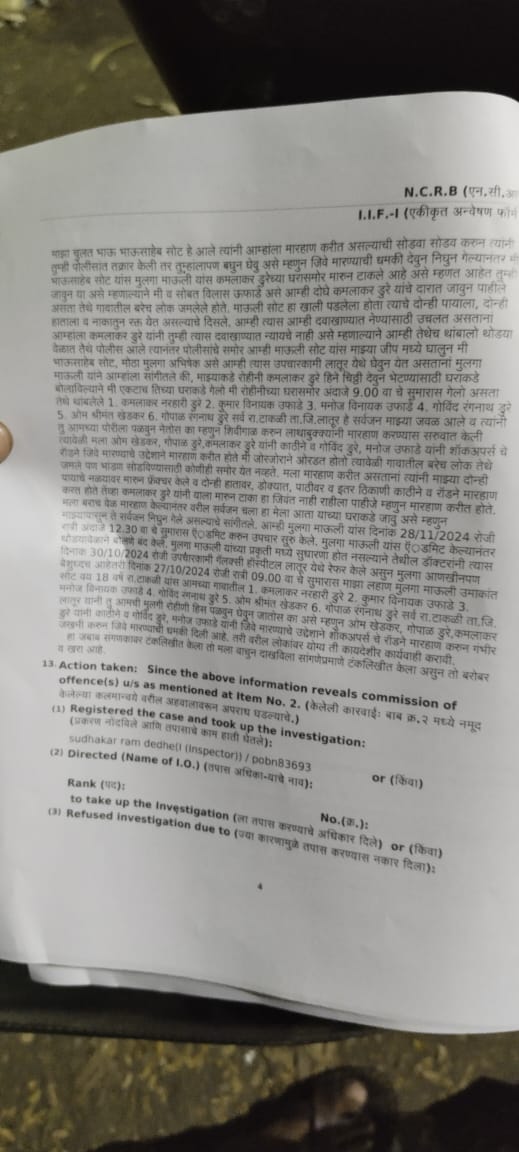 सर्व रा. टाकळी ता. जि. लातूर हे सर्वजण माझ्या जवळ आले व त्यांनी तु आमच्या पोरीला पळवुन नेले. काही करुन लाथाबुक्क्यांनी मारहाण करण्यास सरुवात केली. मला ओढून, गोपाळ डुरे, कमलाकर डुरे यांनी काठीने व गोविंद डुरे, मनोज उफाडे यांनी शॉकऑब्झाॅर्व्हर्सने जिवे मारण्याचे उद्देशाने मारहाण करीत होते. मी जोरजोराने ओरडत होतो. त्यावेळी गावातील बरेच लोक तेथे सोडण्यासाठी कोणीही समोर येत नव्हते. मला मारहाण करीत असतानां त्यांनी माझ्या दोन्ही पायाचे मध्यावर मारुन चार तुकडे केले व दोन्ही हातावर डोक्यात, पाठीवर व इतर ठिकाणी काठीने व रॉडने मारहाण करत होते, तेव्हा कमलाकर डुरे यांनी “याला मारून टाका हा जिवंत नाही राहीला पाहीजे” असे म्हणून मारहाण करीत होते. मारल्यानंतर वरील सर्वजण “चला हा मेला. आता याच्या घराकडे जाऊ” असे म्हणून हे सर्वजण निघुन गेले असल्याचे सांगीतले. आम्ही मुलगा माऊली यास दिनांक 28/11/2024 रोजी 12.30 वा. सुमारास ऍडमिट करून उपचार सुरु केले. मुलगा माऊली यांस ऍडमिट केल्यानंतर मुलगा माऊली याच्या प्रकृती मध्ये सुधारणा होत नसल्याने तेथील डॉक्टरांनी त्यास 30/10/2024 रोजी उपचारासाठी गैलक्सी हॉस्पीटल लातूर येथे रेफर केले असुन मुलगा अजून सुद्धा बेशुद्ध च होता. 27/10/2024 रोजी रात्री 09.00 वा चे सुमारास माझा लहान मुलगा माऊली उमाकांत सोट वय 18 वर्षे रा. टाकळी यास आमच्या गावातील