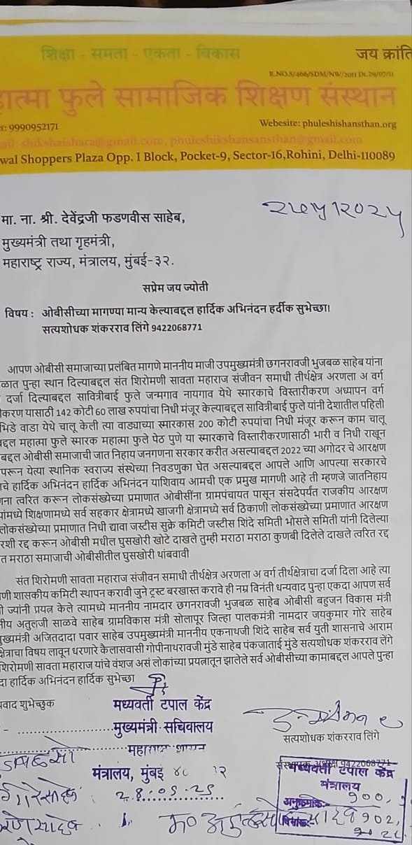 मध्यवर्ती टपाल केंद्र मुंबई या ठिकाणी माननीय मुख्यमंत्री देवेंद्रजी फडणवीस साहेब अन्न व नागरी पुरवठा मंत्री माननीय छगनरावजी भुजबळ साहेब ओबीसी कल्याण मंत्री अतुलजी सावे साहेब क्रीडा व अल्पसंख्यांक मंत्री दत्ता मामा भरणे पर्यावरण मंत्री माननीय पंकजाताई मुंडे ग्रामविकास पंचायत राज सोलापूर जिल्हा पालकमंत्री माननीय जयकुमार गोरे साहेब यांना ऑफिशियल पत्र दिले आहे